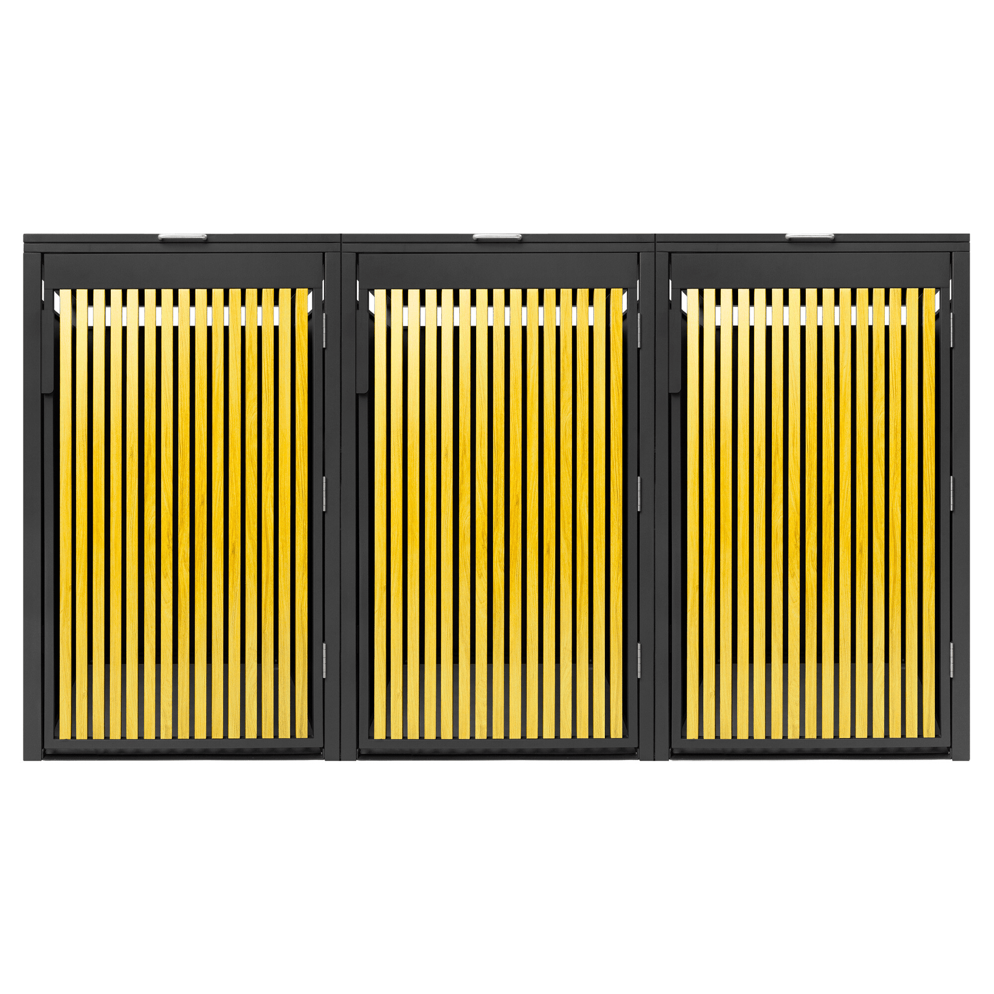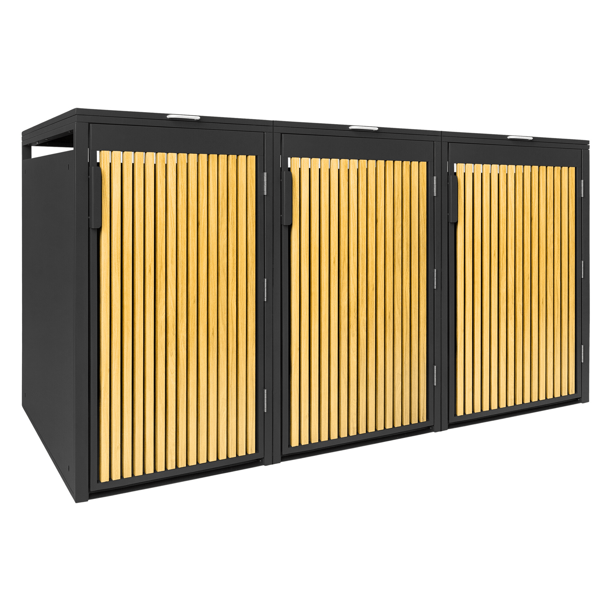 Unsere PANELO 3er Mülltonnenbox mit ihrer exklusiven Holzoptik! Der Blickfang in Ihrem Außenbereich. Ideal für Mülltonnen bis zu 240L.